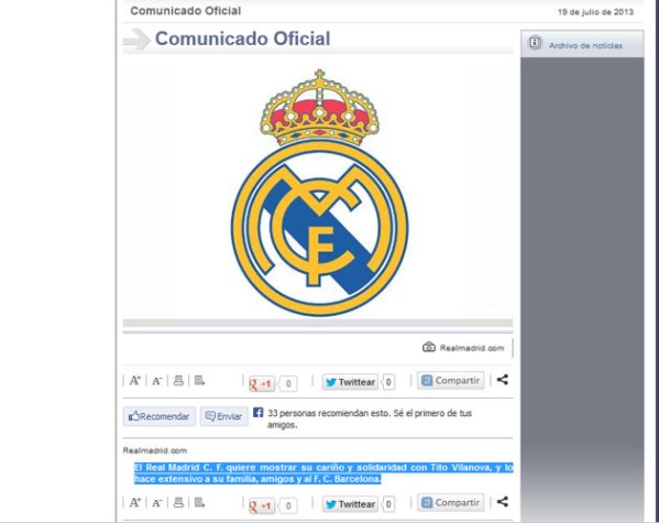 Đội bóng hoàng tộc Tây Ban Nha đã gửi một thông điệp mang tính động viên tới Tito Vilanova, gia đình ông và CLB Barcelona.
